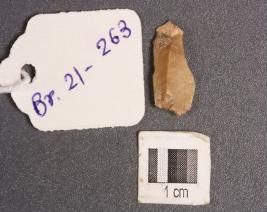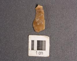 | Description / विवरण | A microlithic chert blade with a mid ridge on dorsal side, bulb on ventral side, pointed at distal end with cortex, triangular in section and use wear marks on cutting edges. |
