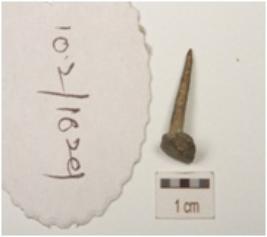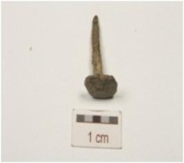 | Description / विवरण | A copper nail, pointed at one end and broad on other end, corrodate surface. |