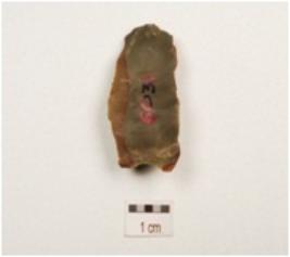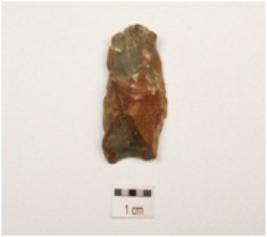 | Description / विवरण | Chert blade with flake scars and cortex on dorsal, bulb on ventral, use wear marks on cutting edge and trapezoid in section. |