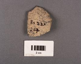 | Description / विवरण | Stone flake with flake scars and mid ridge on dorsal, bulb on ventral, broken distal end. Triangular in section and use wear marks on cutting edge. |