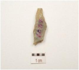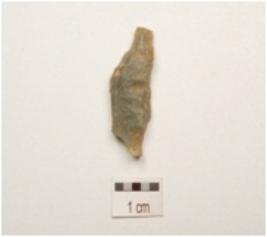 | Description / विवरण | Chalcedony blade with double ridge on dorsal, trapezoid in section, diffused bulb on ventral , use wear marks on cutting edge and broken along distal end. |