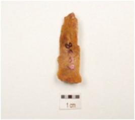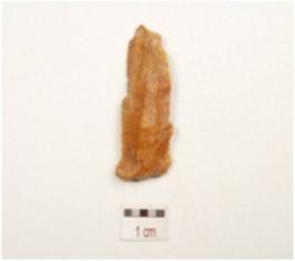 | Description / विवरण | Chert blade with two ridge on dorsal, diffused bulb on ventral , striking platform, trapezoid in section and use wear marks on cutting edges. |