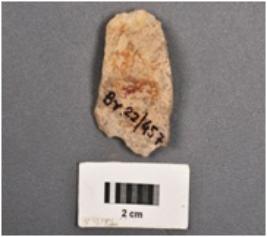 | Description / विवरण | A flake made on quartz with a ridge on dorsal side, prepared platform, broken along at distal end, triangular in section and use wear marks on edges. |