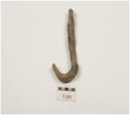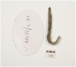 | Description / विवरण | Fragment of copper hook rectangular cross section, slightly curved one end and corrodated surface. |