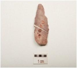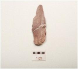 | Description / विवरण | Chert blade with mid ridges on dorsal side, prepared platform, bulb on ventral side, partly broken at one edges, use wear marks along cutting edges and triangular in section. |