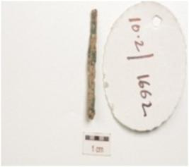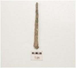 | Description / विवरण | Fragment of a copper nail, square cross section, tapering to the pointed end and broken from both ends. |