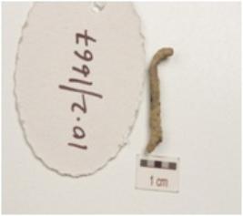 | Description / विवरण | Fragment of a copper hook, rectangular cross section, tapering sides and weathered surface. |