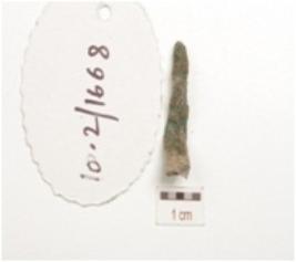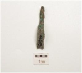 | Description / विवरण | Fragment of copper nail, rectangular cross section, tapering sides and weathered surface. |