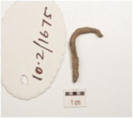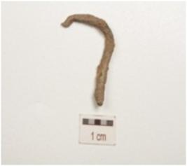 | Description / विवरण | Fragment of a copper hook, pointed curved end is intact, circular cross section and weathered surface. |