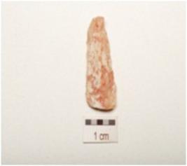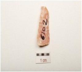 | Description / विवरण | Chert parallel sided blade with two ridges on dorsal side, striking platform diffused bulb on ventral side, broken along at distal end, use wear marks along at cutting edges and trapezidal in section. |