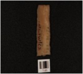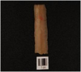 | Description / विवरण | Fragment of parallel sided chert blade, use wear marks along the cutting edge, trapezoidal cross section and two ridges on dorsal side. |