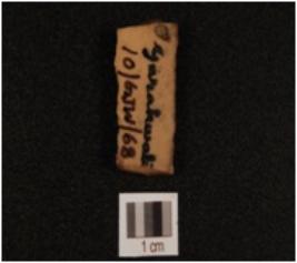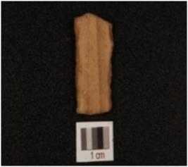 | Description / विवरण | Fragment of chert blade, use wear marks along the cutting edge, trapezoidal cross section and two ridges on dorsal side. |