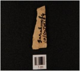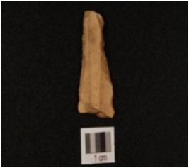 | Description / विवरण | Fragment of chert blade, use wear marks along the cutting edge, trapezoidal cross section and two ridges on dorsal side. |