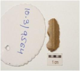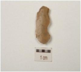 | Description / विवरण | Chert blade with striking platform absent, ridge on dorsal surface and wear marks on both working edges. |