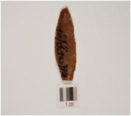 | Description / विवरण | A chert blade, irregular retouch along the cutting edge, two ridge on dorsal side, trapezoidal cross section and prominent bulb on ventral side. |