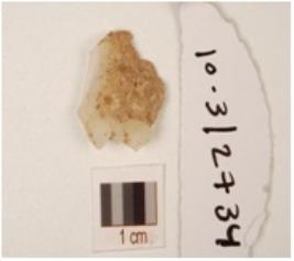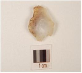 | Description / विवरण | Flake made of chalcedony, flake scars on the surface, prepared platform, prominent bulb and plano-convex section. |