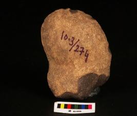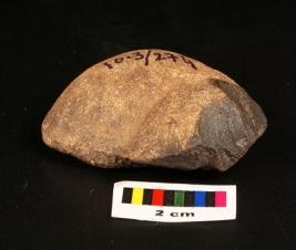 | Description / विवरण | A end scraper made on a side struck flack, bul baus affearance from dordal side, cortex is present, regular rectouch along disital end. |