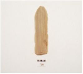| Description / विवरण | Chert parallel sided blade, ridge on dorsal striking platform, bulb on ventral broken along at distal end, use wear marks along cutting edges and triangular cross section. |