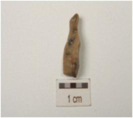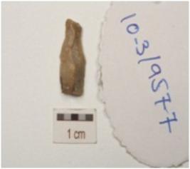 | Description / विवरण | Chert blade, proximal end broken, triangular cross section, a ridge on dorsal surface and wear marks on both working edge. |