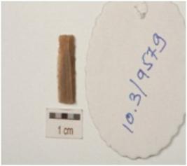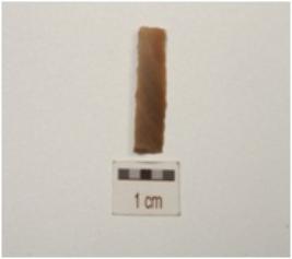| Description / विवरण | Parallel sided chert blade, proximal end broken, trapezoidal cross section, two ridges on dorsal surface, wear marks on one working edge and retouches on another. |