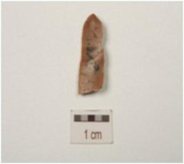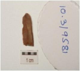 | Description / विवरण | Parallel sided chert blade, distal end broken, triangular cross section, a ridge on dorsal surface, prominent bulb with striking platform and wear marks on both working edge. |