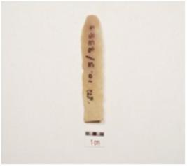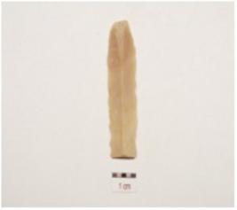 | Description / विवरण | Chert parallel sided blade a prominent ridge on dorsal striking platform, diffused bulb on ventral partly broken along at distal end, irregular retouches on cutting edges and triangular cross section. |