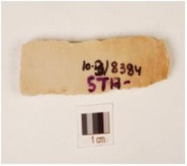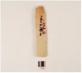 | Description / विवरण | A chert blade with double ridge on dorsal trapezoid cross-section, prepared platform and bulb on ventral. |