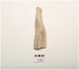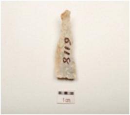 | Description / विवरण | Chert blade with two ridges on dorsal side partly broken proximal end, use wear marks along cutting edges, broken along at distal end and trapezoidal in section. |