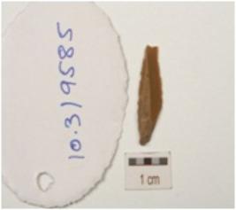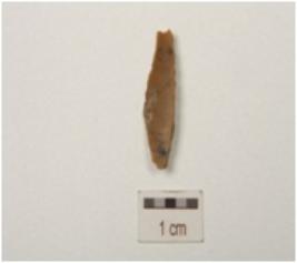 | Description / विवरण | Chert backed blade, proximal end broken, wear marks on working edge and a ridge on dorsal surface. |