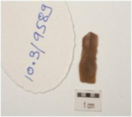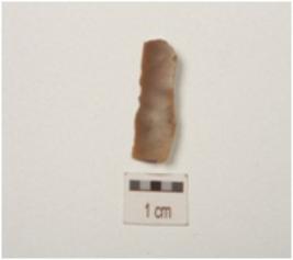| Description / विवरण | Parallel sided chert blade, both ends broken, a ridge on dorsal surface, triangular cross section and wear marks on both working edges. |