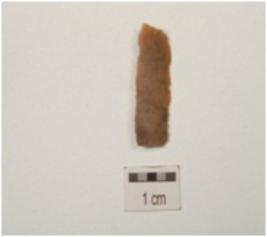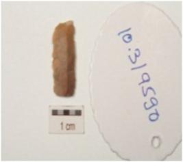 | Description / विवरण | Parallel sided chert blade, proximal end broken, triangular cross section, a ridge on dorsal surface and use wear marks on both working edge. |