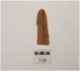 | Description / विवरण | Parallel sided chert blade, distal end broken, diffused bulb with striking platform, triangular cross section mid ridge on dorsal surface and use wear marks on both working edge. |
