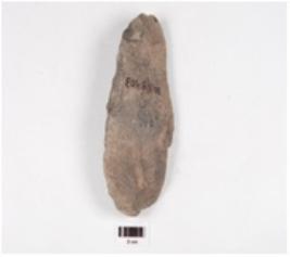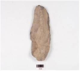 | Description / विवरण | A handaxe made of end struck basalt flake, flake scars visible on the surface. |
