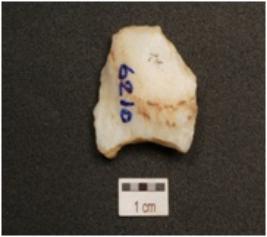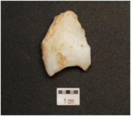 | Description / विवरण | A flake made on quartz, bladescars on dorsal side, broken on both ends, use wear marks along cutting edge. |