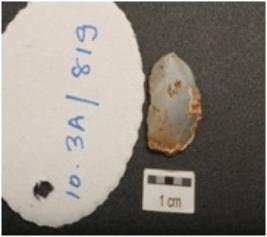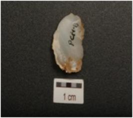 | Description / विवरण | End struck chalcedony flake, prominent bulb on ventral surface, chipped off dorsal surface and cortex visible. |