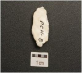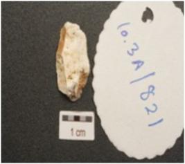 | Description / विवरण | End struck chert flake, positive bulb on ventral surface, use wear marks along cutting edges and cortex visible. |