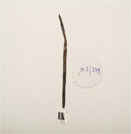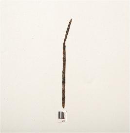 | Description / विवरण | An iron nail, bended one side, rough surface, polished and chemically treated surface, roughly circular section. |
