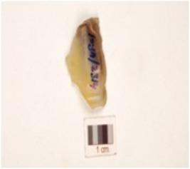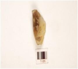 | Description / विवरण | A lunate shaped utilized flake has use wear marks on one end and blade scars and cortex on the surface. |