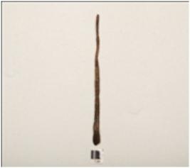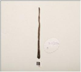 | Description / विवरण | An iron pin, pointed one end, irregular square cross section, polished and chemically treated surface. |