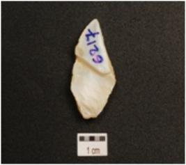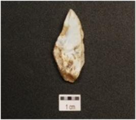 | Description / विवरण | A flake made on chalcedony, bladescars on surface, cortex on one end. |