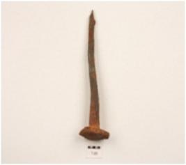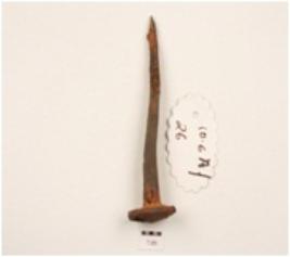 | Description / विवरण | An iron nail, tapering to a pointed end, intact both ends, flat circular head, squarish section. |