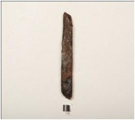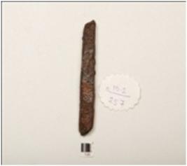 | Description / विवरण | A fragment of a iron chisel, polished and chemically treated surface, rectangular in shaped, square in cross section. |