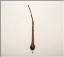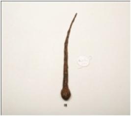 | Description / विवरण | An iron nail pointed and slightly bended one end, with round head one side, polished and chemically treated surface. |