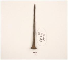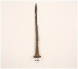 | Description / विवरण | An iron nail tapering to the pointed end, flat circular head, squarish cross section, both ends, intact. |
