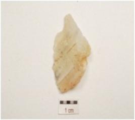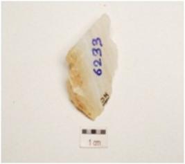 | Description / विवरण | Flake made on chalcedony, cortex on proximal end, irrecular cutting edge, bladscars on surface. |