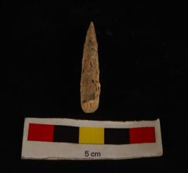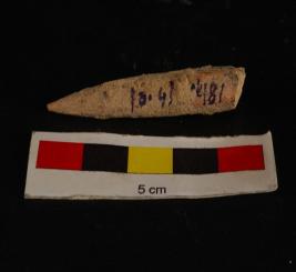 | Description / विवरण | Fragment of a bone point with mud incrustation on surface. Pointed one end and circular in section. |