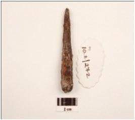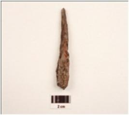 | Description / विवरण | An iron nail, fragment, pointed shape, surface is uneven, head is missing and pointed bottom. |