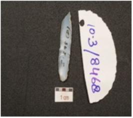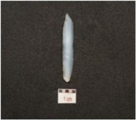 | Description / विवरण | A blade made of chalcedony, prominent bulb on ventral 2-ridge on the dorsal and retouched cutting edges. |