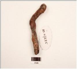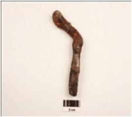 | Description / विवरण | An iron nail, twisted in shape, uneven surface, cracks visible. |