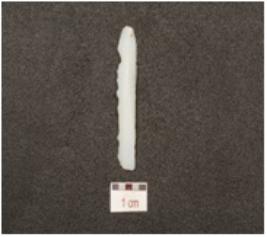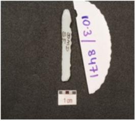 | Description / विवरण | A blade made of chalcedony, prominent bulb on ventral ridge on the dorsal partly retouches cutting edges. |